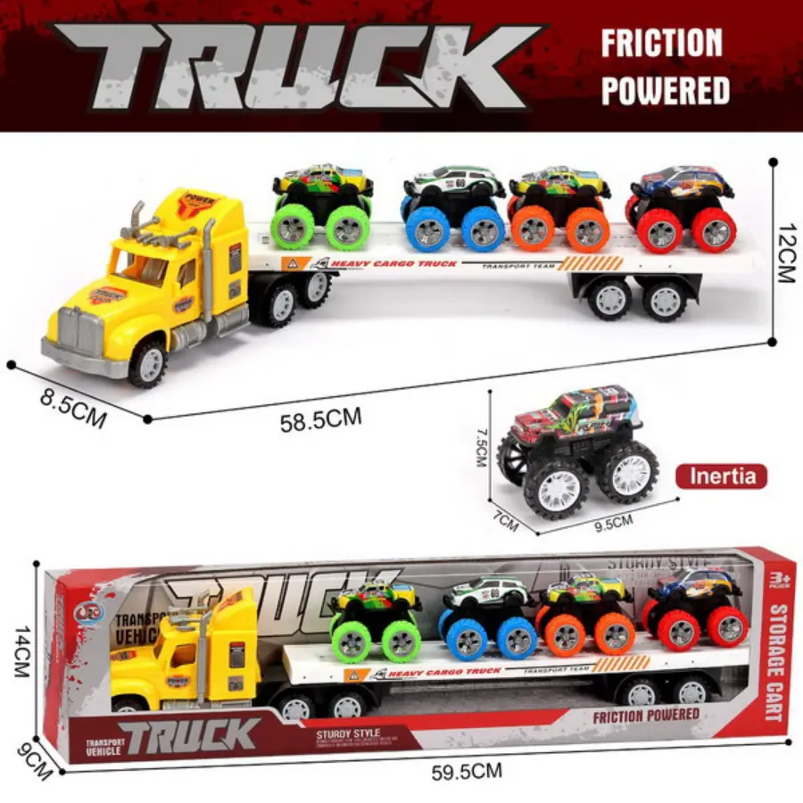 Friction Powered Heavy Cargo Transporter Truck with 4 Mini Monster Car