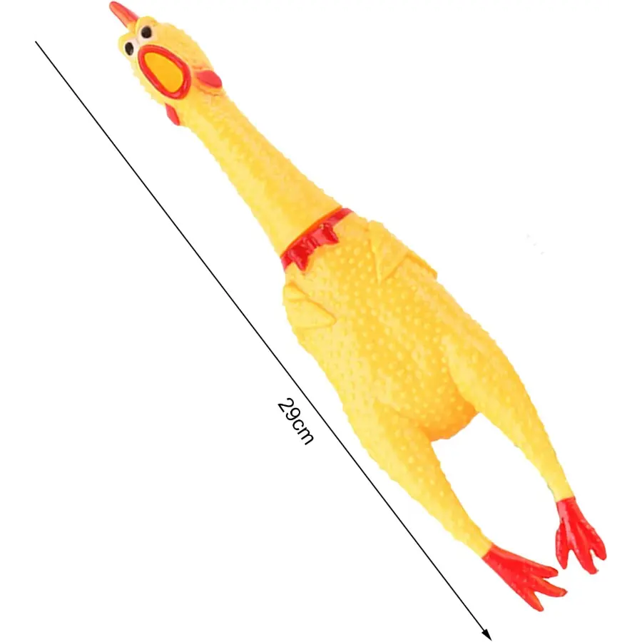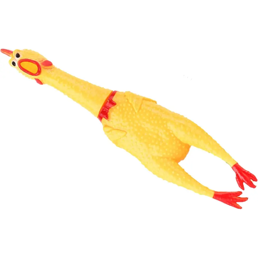 A squeaky noise-maker inside for that iconic rubber chicken scream